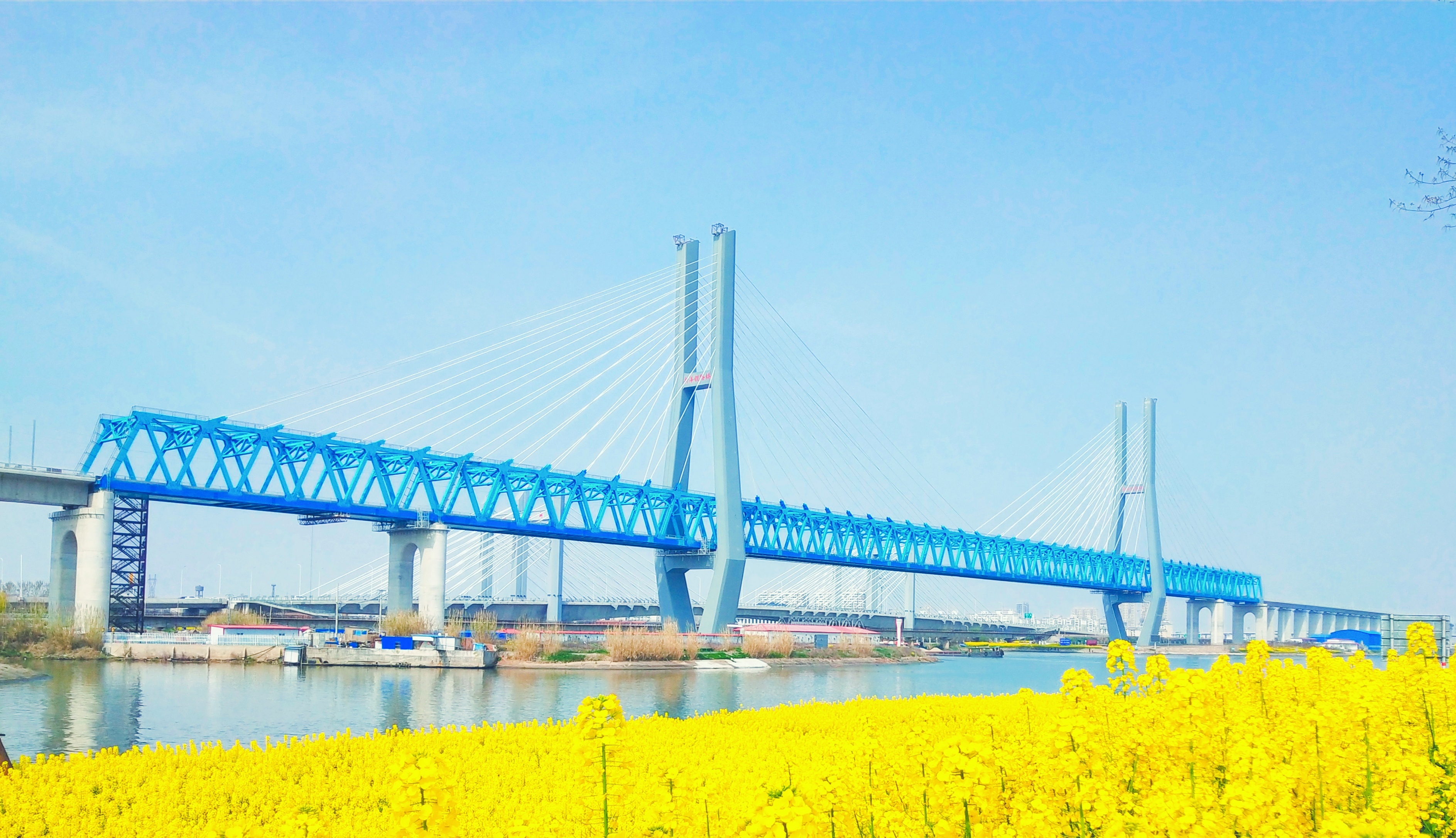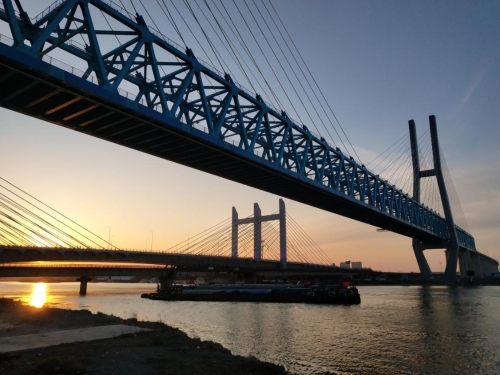 新建徐盐铁路盐城特大桥为徐盐铁路关键控制性工程之一,全长38.47km。桥面采用的热轧不锈钢复合钢板,开创了国内首次使用的先河。跨新洋港采用(72+96+312+96+72)m连续钢桁梁斜拉桥,斜拉桥全长650.6m。跨新洋港斜拉桥采用梁塔分离,半漂浮体系,是我国跨度最大的双线有砟轨道时速250km/h高速铁路钢桁斜拉桥。