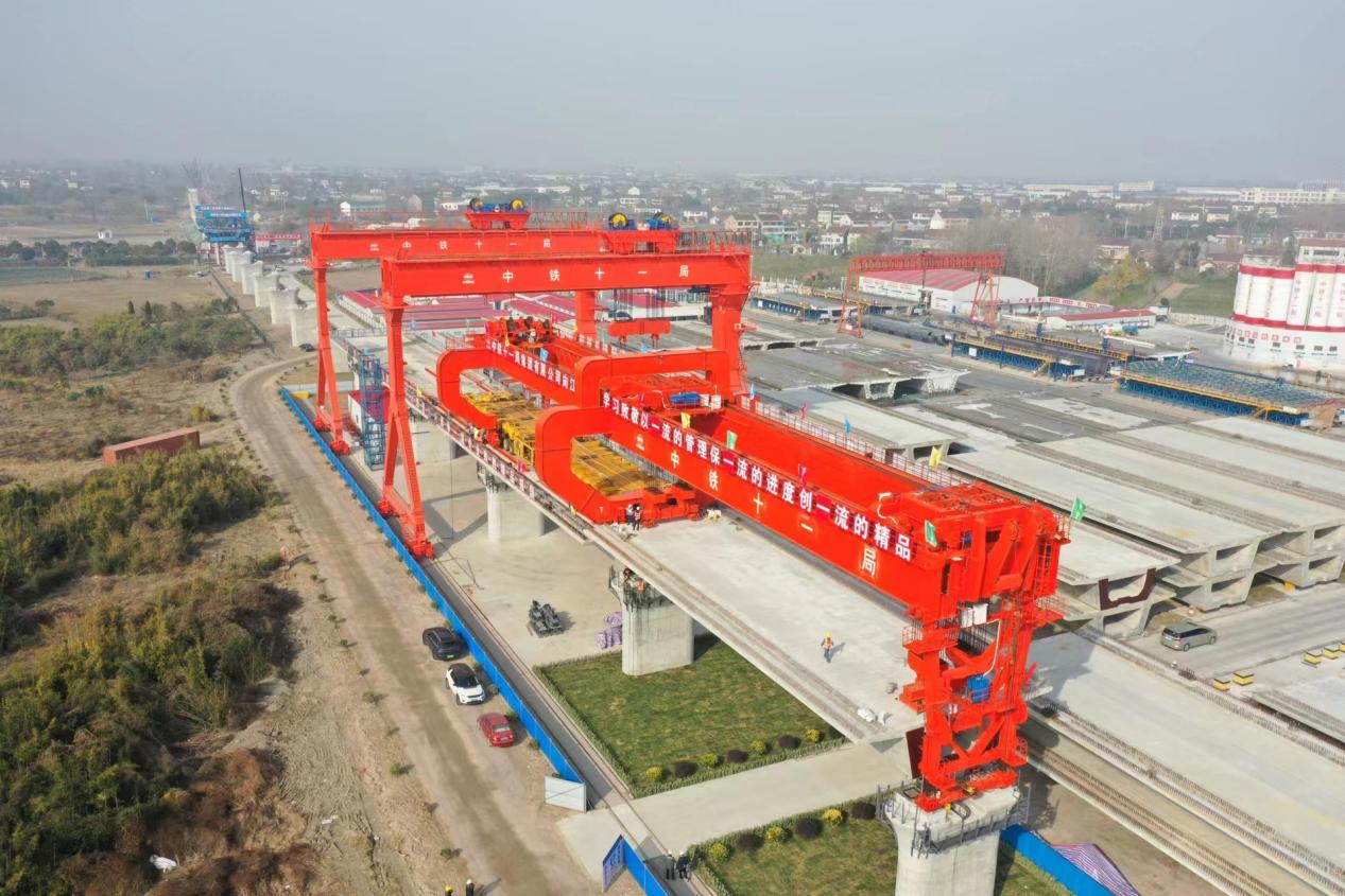 由中铁十一局承建的北沿江高铁站前9标,正线全长29.46公里,主要包括通泰扬特大桥29.46公里、黄桥站维修工区路基583米,桥涵占比100%;现浇连续梁12处,道岔梁4处,梁场制、运、架箱梁854榀以及CRTSIII型板无砟道床29.46双线公里。