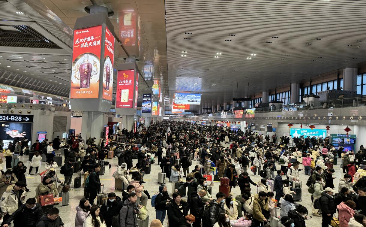 春运伊始,首波返乡客流如期而至,江苏铁路客流明显升高,1月26日至29日,江苏铁路日均发送旅客86.59万人次,其中1月29日达90.56万人次。1月30日开始,东北、华北地区出现中到大雪,2月1日安徽北部、江苏北部先后迎来大雪,严重影响运输秩序,铁路部门积极采取道岔、接触网融雪、大客流应对等各项举措,尽量降低恶劣天气带来的影响,全力保障旅客出行,江苏铁路客流持续保持高位运行。
