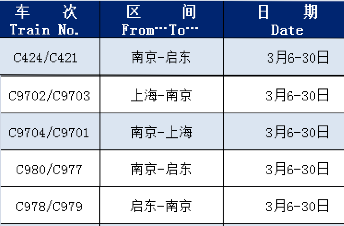 根据旅客出行需求,自3月6日起,宁启铁路将恢复和增开南京—启东、南京—上海的多趟旅客列车。