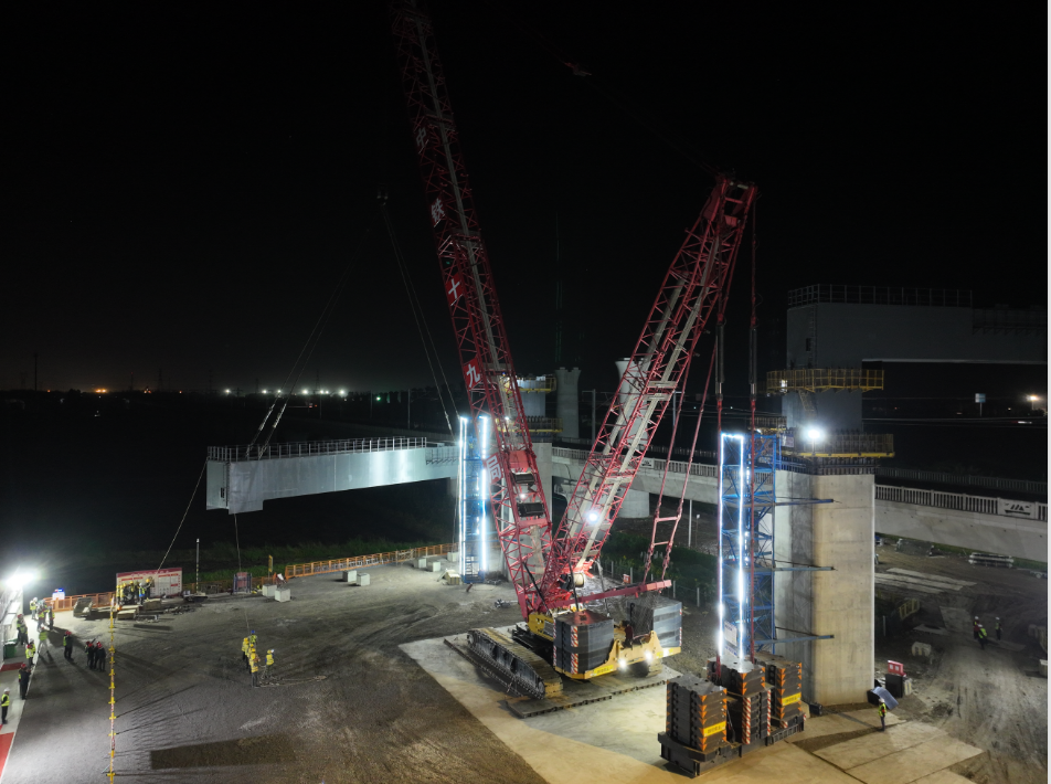 10月23日凌晨,在中铁十九局宁淮城际铁路站前1标黄楼至洪泽左单线特大桥施工现场,随着最后一榀钢盖梁精准落位到桥墩钢柱脚上,标志着宁淮城际铁路站前1标关键节点——上跨连淮扬镇铁路钢盖梁吊装作业圆满收官,为后续架梁和无砟轨道施工奠定坚实基础。