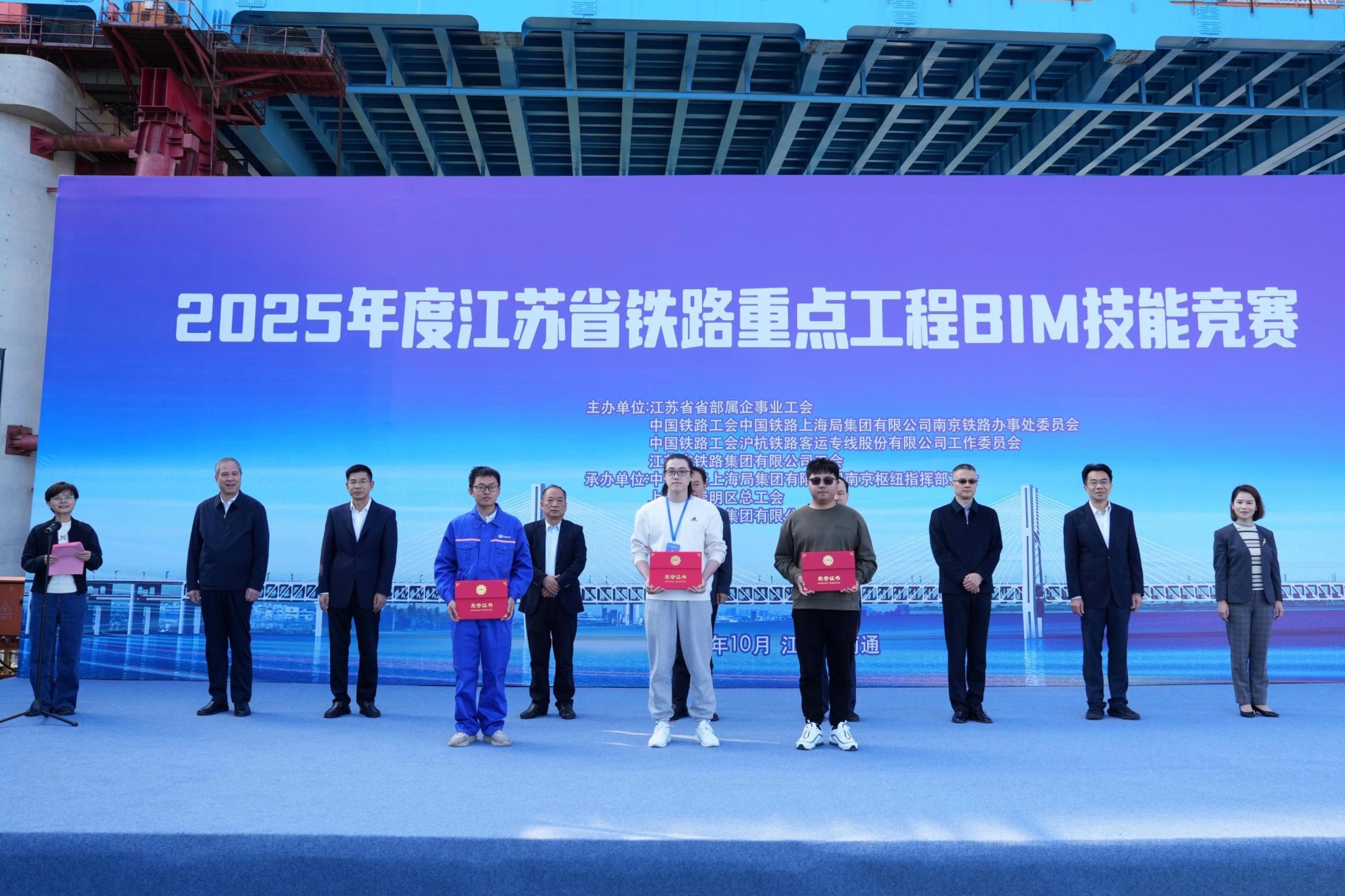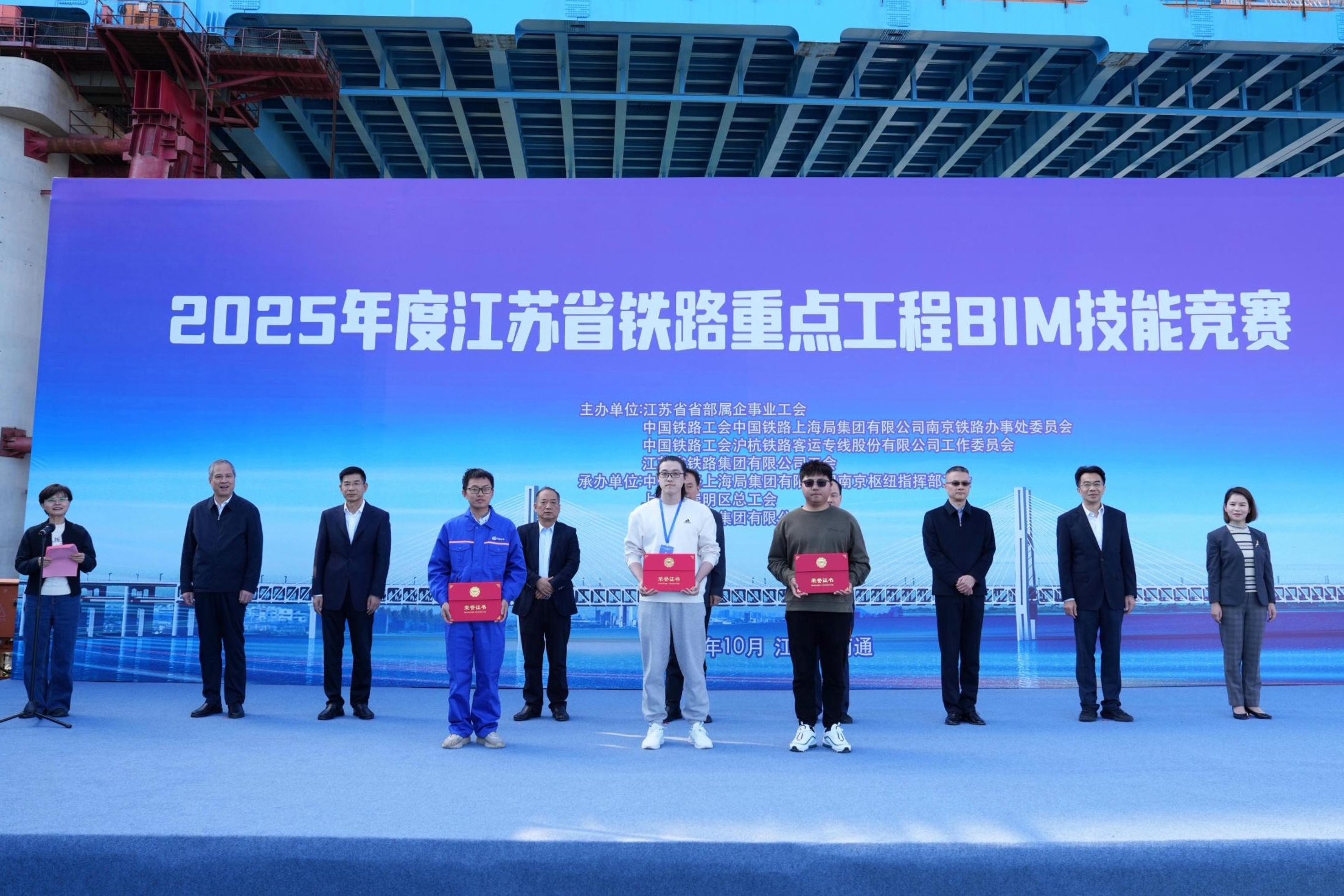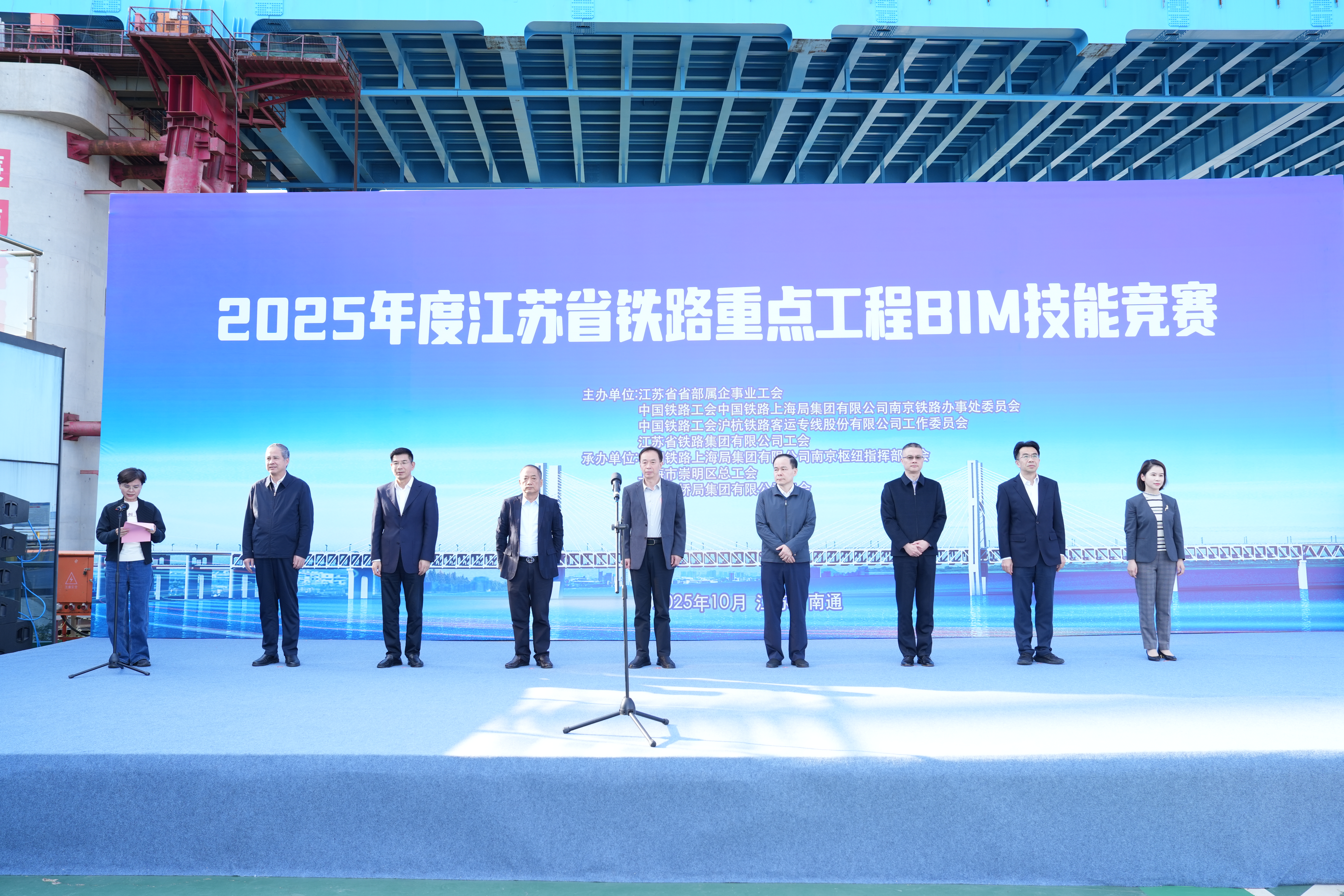 江苏省总工会二级巡视员何应洋,南京铁路枢纽指挥部党委书记周斌,江苏省铁路集团副总经理、党委委员史良洪,江苏省省部属企事业工会主任董彬,南京铁路办事处副主任赵翔,沪杭客专公司党群工作部(人力资源部)主任张若海,中铁大桥局集团党委副书记、工会主席张春全,上海市崇明区总工会副主席陆婷婷出席了28日举行的2025年度江苏省铁路重点工程BIM技能竞赛闭幕式。闭幕式由江苏省铁路集团党委副书记、工会主席王勤主持。