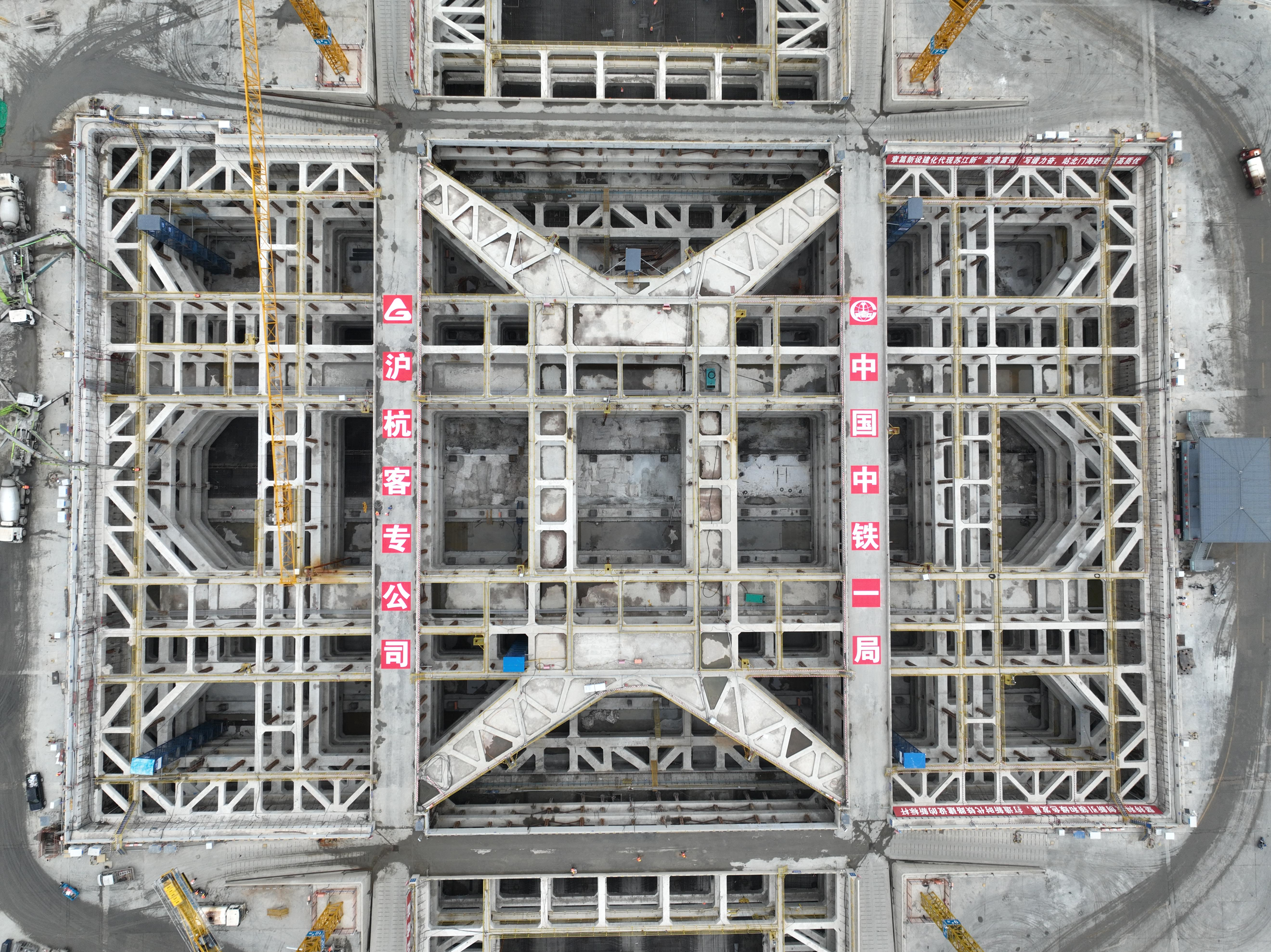 据集团工程技术部负责人介绍,海门北站基坑连续开挖长度达1.8公里,相当于8.5列CR400BF-Z型动车组首尾相连;最大开挖深度29.4米,相当于10层楼高度;总开挖土方量约148万立方米,围护结构采用1.2米地连墙加5道混凝土支撑。其中核心区基坑长104米、宽166米,底板总面积1.7万平方米,厚度1.5米,共划分为16个区段浇筑,总混凝土方量约3.2万立方米,工程规模宏大、结构复杂、技术难度高,是目前国内最长的超深超大基坑地下高铁站。