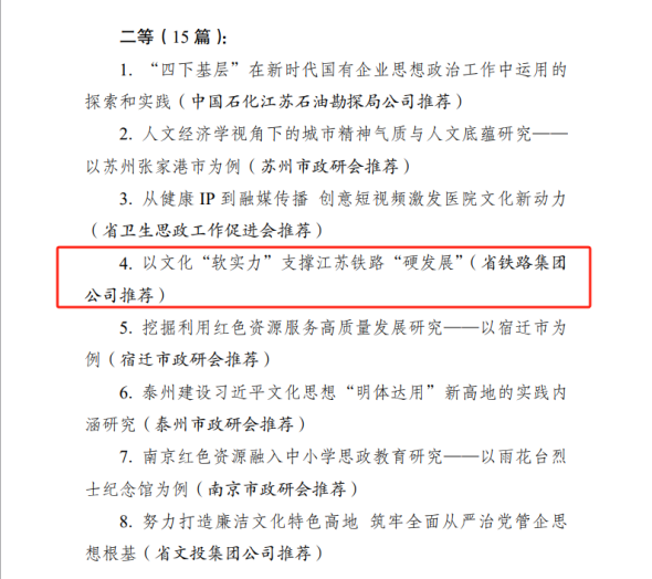 2024年度全省思想政治工作课题研究优秀成果评选结果近日出炉,集团推荐的研究成果《以文化“软实力”支撑江苏铁路“硬发展”》获评全省二等奖。