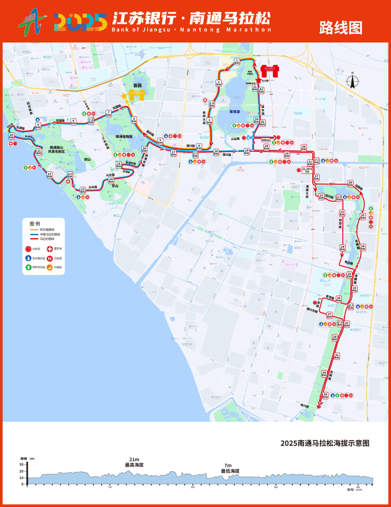 南通马拉松赛道以“江海交融”为主题,将现代都市与自然风光无缝衔接,符合中国田协A1标准,路面平整、标识清晰,全程串联紫琅湖景区、狼山国家森林公园、滨江风光带等标志性景点。跑者可沿途欣赏“江海第一山”狼山的葱郁山色、江豚湾的生态画卷,以及能达生态通廊的湖光天色,在运动中感受南通“城水一体”的独特魅力。