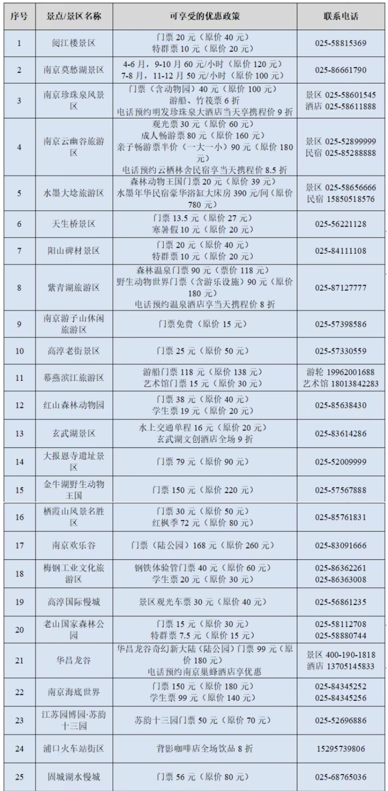 本次优惠活动涵盖南京25家特色景区景点,其中18家为4A级旅游景区,包括玄武湖景区、红山森林动物园、莫愁湖景区、大报恩寺遗址等。参与活动的景区有近10家门票半价,南京游子山休闲旅游区门票免费。
