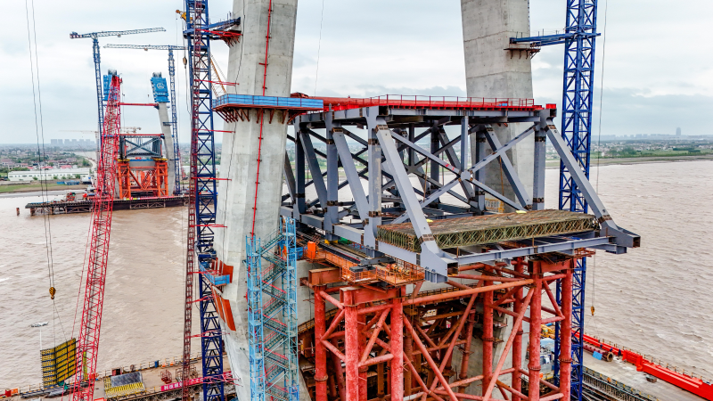 4月27日,北沿江高铁崇启公铁长江大桥主通航孔钢梁导梁在3、4号主墩顺利拼装完成,标志着大桥建设工作再次取得阶段性进展,为崇启公铁长江大桥主通航孔钢梁架设顶推的顺利推进创造了有利条件。