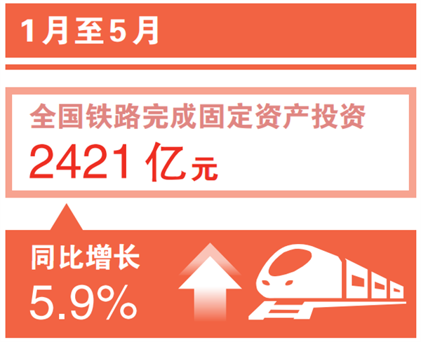 今年1月至5月,铁路建设优质高效推进,全国铁路完成固定资产投资2421亿元,同比增长5.9%,有效发挥了投资拉动作用,为经济社会发展注入新动能。