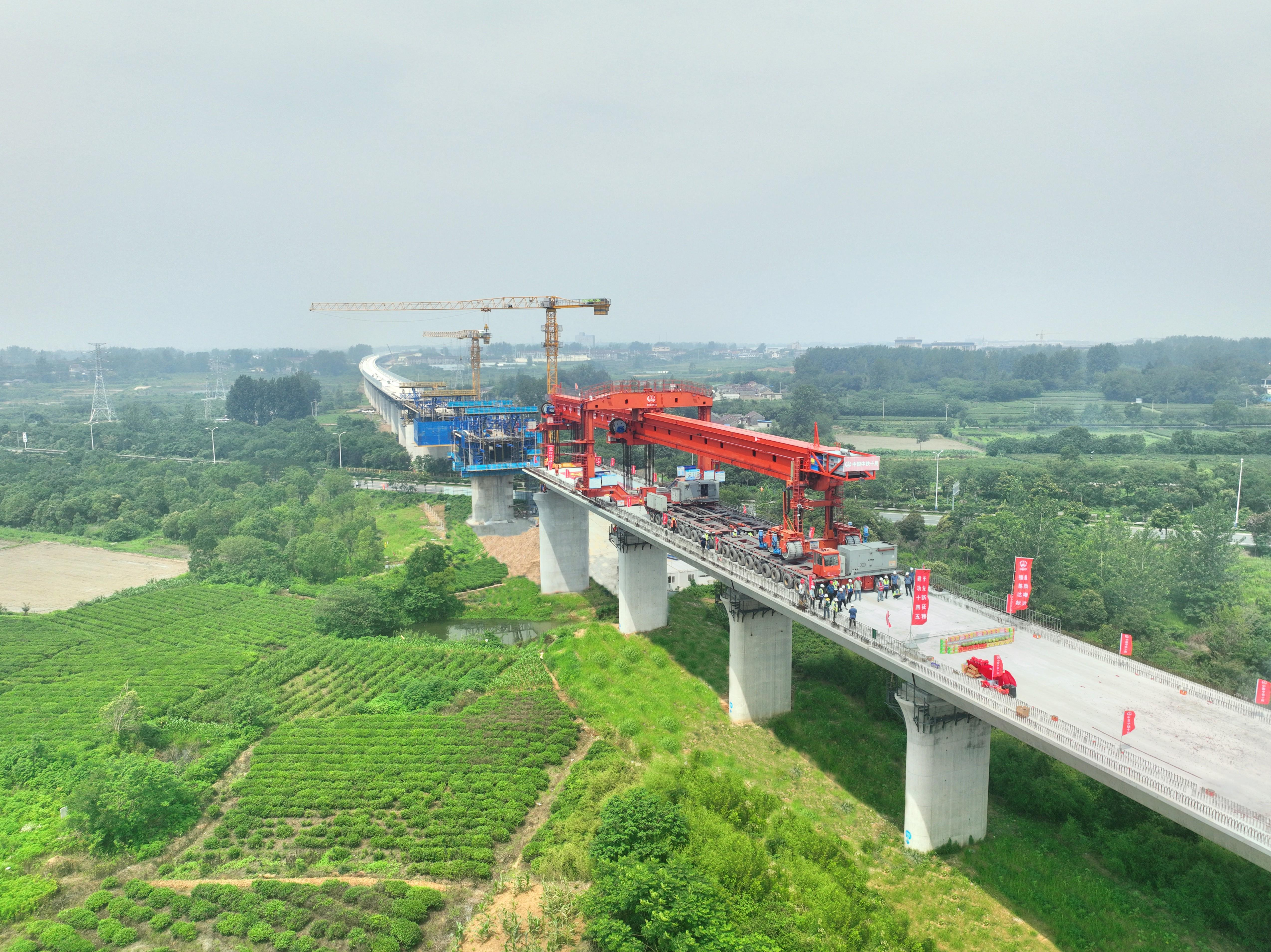 6月26日,随着4955-4956号墩的最后一榀箱梁缓缓落下,北沿江高铁站仪征段内所有箱梁架设任务顺利完成,全面转入桥面系工程施工及附属设施建设阶段,标志着该项目建设取得阶段性成果,为后续无砟轨道施工奠定了坚实基础。