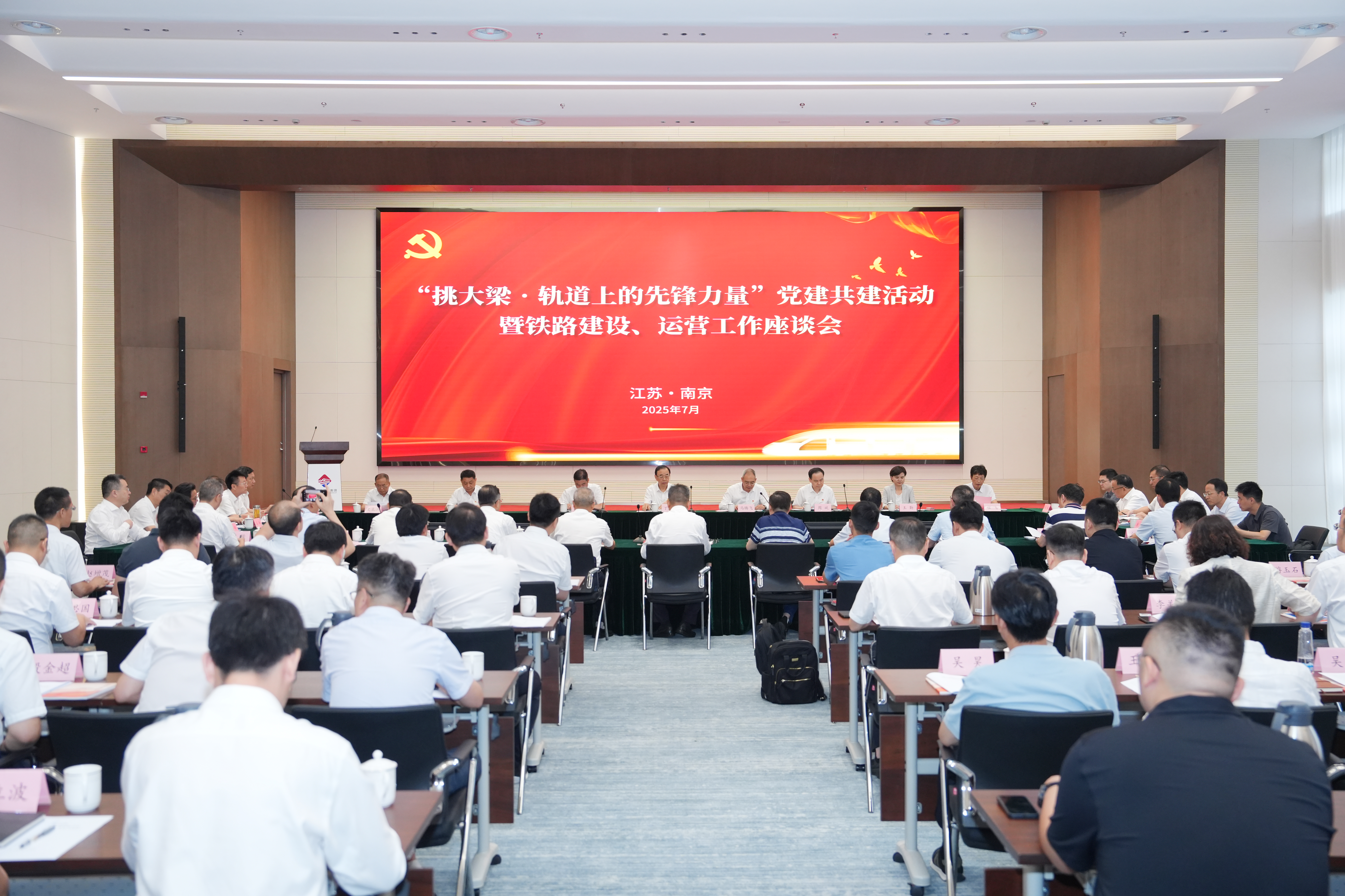 为深入学习贯彻习近平总书记关于“经济大省要挑大梁”的重要讲话精神和加强党的作风建设的重要论述,奋力扛起江苏铁路事业发展的使命担当,进一步聚合我省铁路建设、运营单位党建资源,持续锻造优良作风,以高质量党建引领推动江苏铁路事业高质量可持续发展,7月22日,“圆梦高铁”党建共建活动暨铁路建设运营工作座谈会在南京举行。27家在苏铁路建设、运营单位代表,围绕“挑大梁•轨道上的先锋力量”主题,共建铁路先锋阵地、共商铁路发展大计,以党建共建合作加快推进“轨道上的江苏”建设再上新台阶。