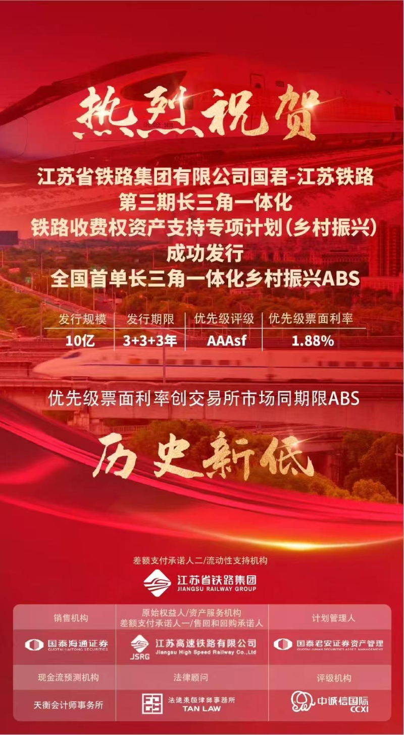 近日,高铁公司成功发行第三期长三角一体化铁路收费权资产支持专项计划(乡村振兴)(以下简称“本期ABS”),发行规模10亿元,发行期限为3+3+3年期,优先级票面利率1.88%,创交易所市场同期限ABS历史新低。