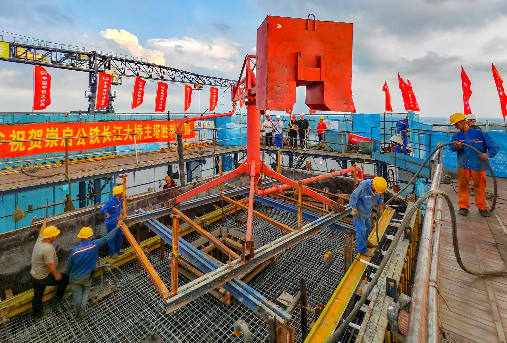 9月29日上午,在万里长江入海口,最后一方混凝土从崇启公铁长江大桥3号与4号主塔施工平台同时泵送,浇筑至153米高的塔顶,标志着这座目前在建的世界最大跨度公铁两用无砟轨道斜拉桥双主塔同日封顶。大桥由此转入斜拉索挂索施工新阶段,为大桥主桥钢梁合龙奠定了坚实基础。