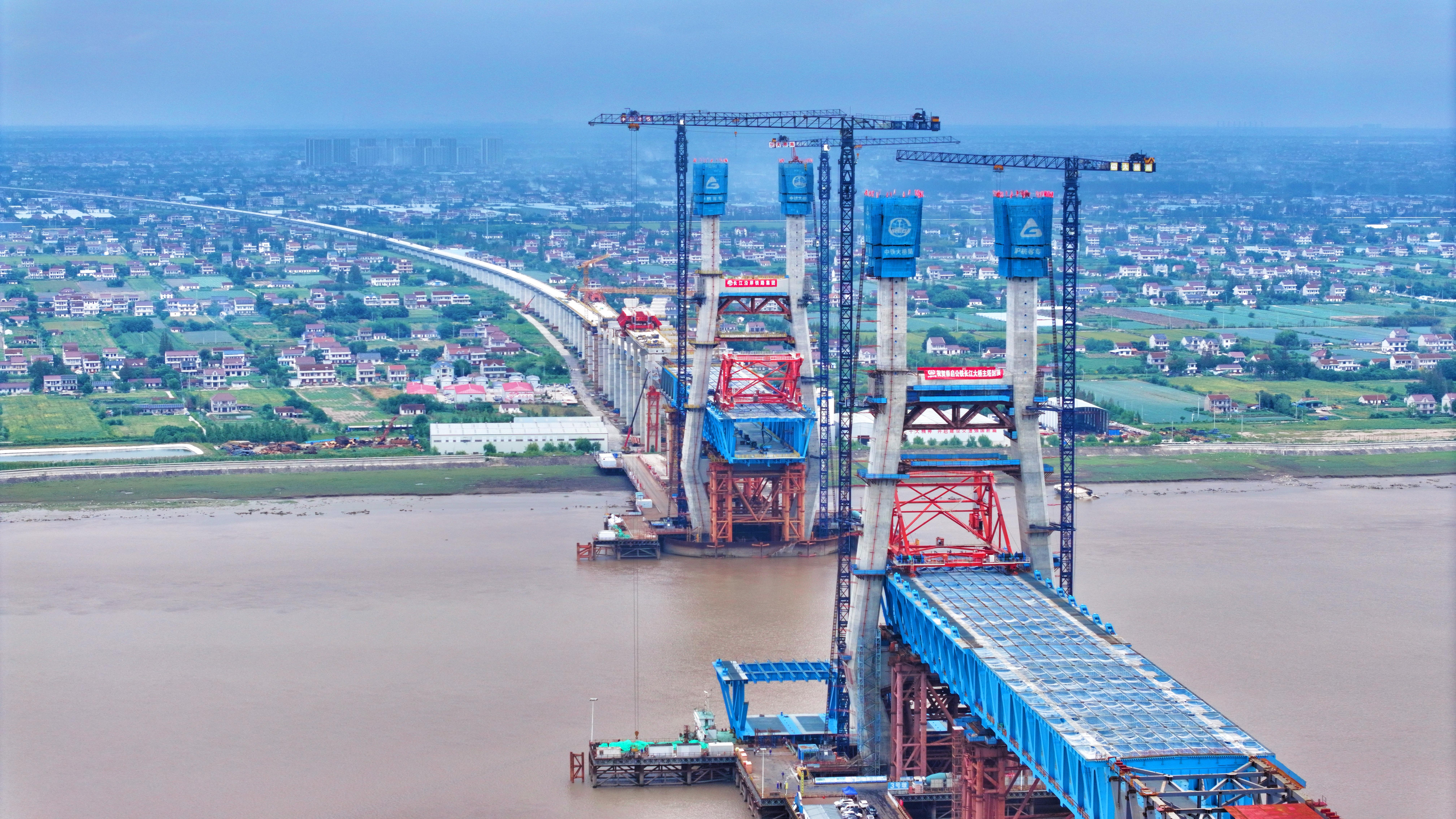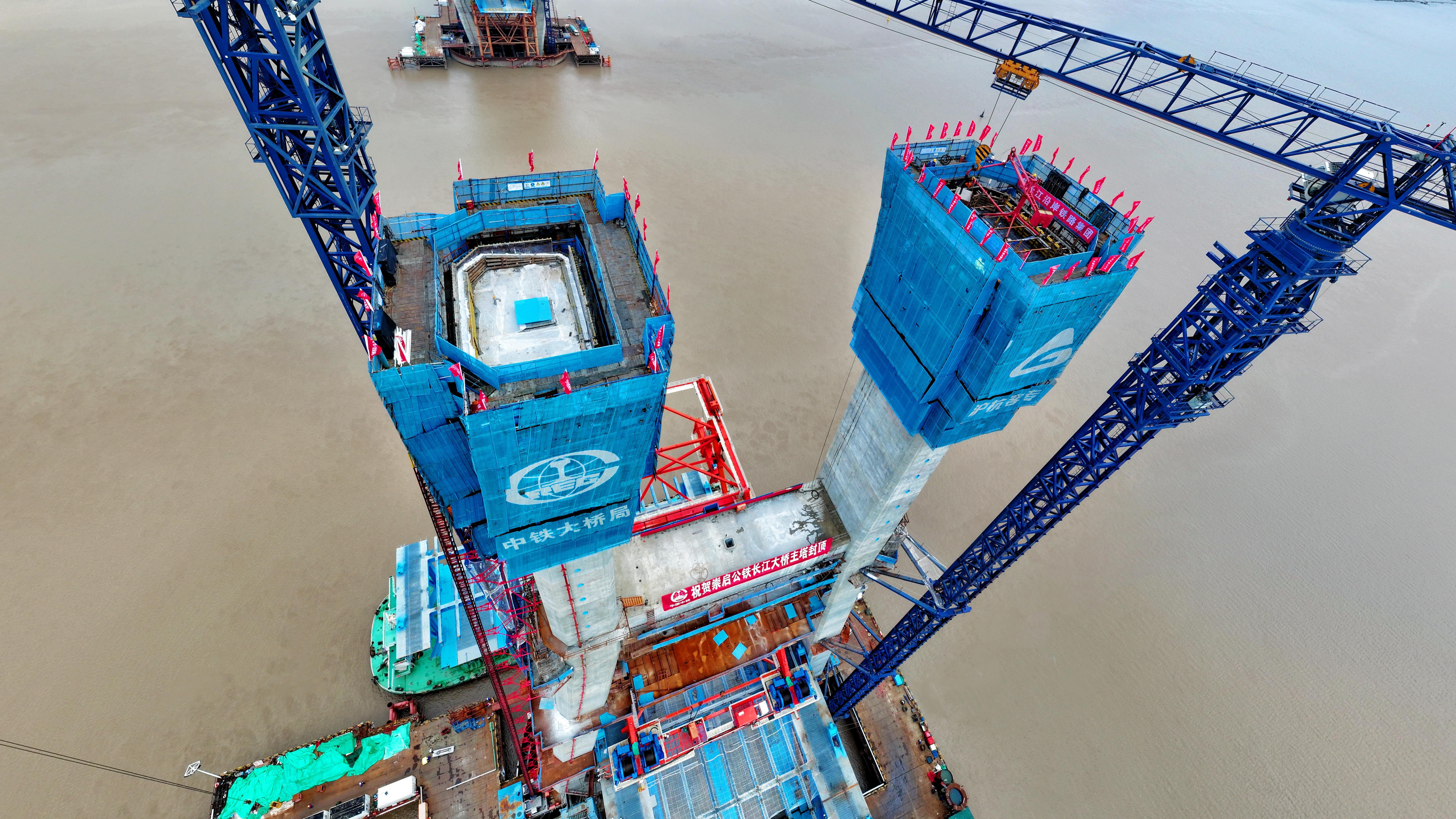 崇启公铁长江大桥地处长江入海口,地质条件复杂,沙地软土给桥梁基础钻孔桩施工带来诸多挑战;施工区域受潮汐与水流影响,给钢围堰吊装加固和水上承台作业带来较大考验。项目团队在近三年建设中系统谋划、攻坚克难,科学统筹人员、物资等各类资源,精心组织施工作业,确保两座主塔的每道工序、每个节点均符合设计要求、质量标准。